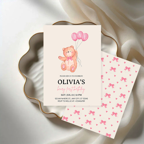 Beary First Pink Balloon 1st Birthday Teddy Invitation – Editable Canva Template
