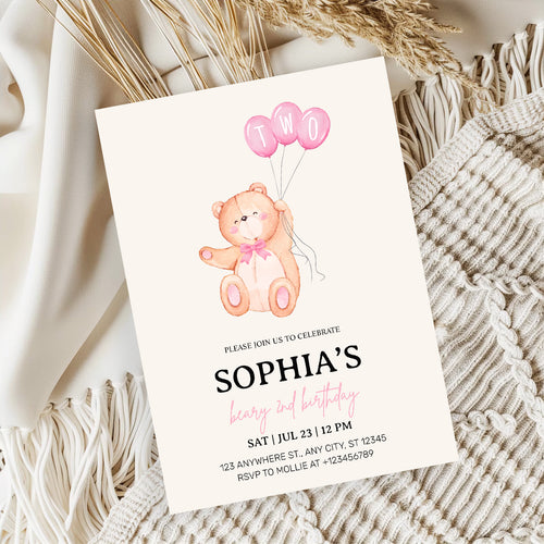 Beary Pink Balloon 2nd Birthday Teddy Invitation – Editable Canva Template