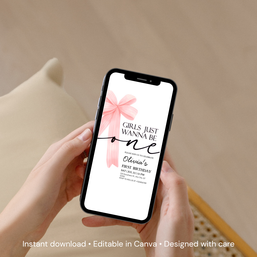 Blush Pink Bow Onederful 1st Birthday Invitation Template | Girl First Birthday Party Invite | Editable Canva Instant Download
